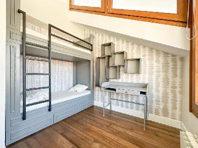 Na prvom nivou se nalaze dnevni boravak, terasa, kuhinja sa trpezarijom, dečija soba sa krevetima na sprat i ugradnim garderoberom, kupatilo i toalet, dok se na drugom nalaze spavaća soba sa francuskim ležajem, Walk In garderober i kupatilo.